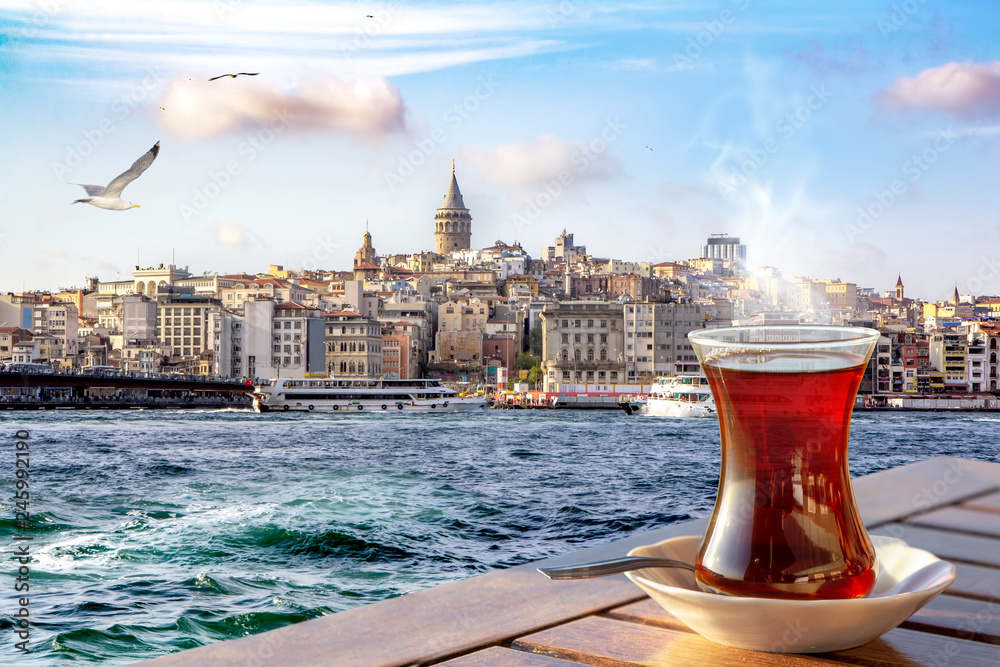 Fototapeta A cup of Turkish tea in a traditional glass against the background of the Golden