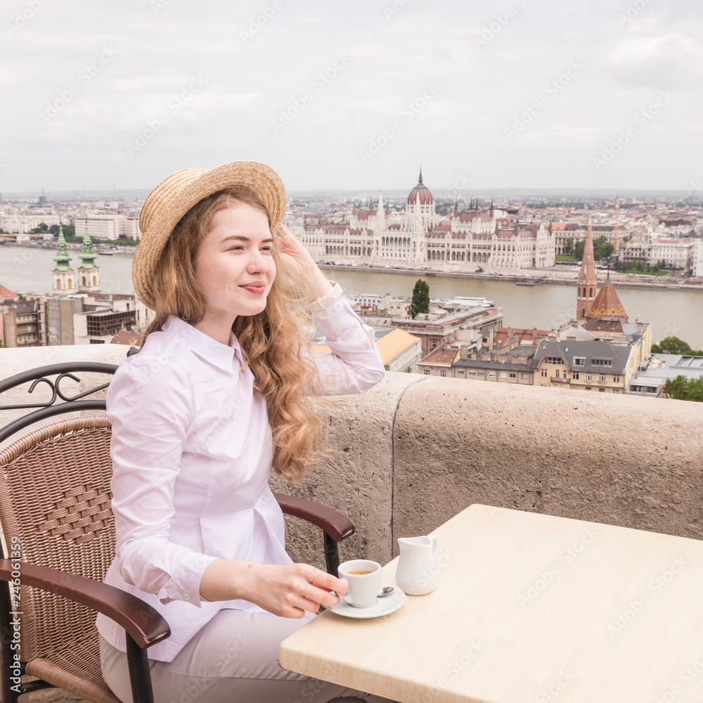 Fototapeta Attractive happy woman having a coffee in the Budapest