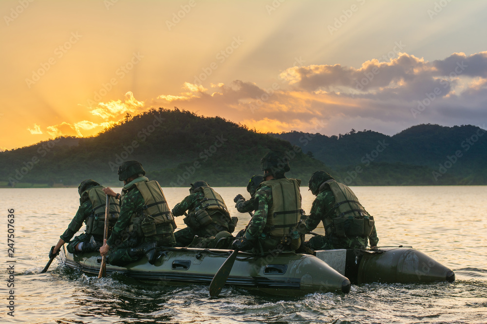 Fototapeta Special forces men in camouflage uniforms paddling army kayak