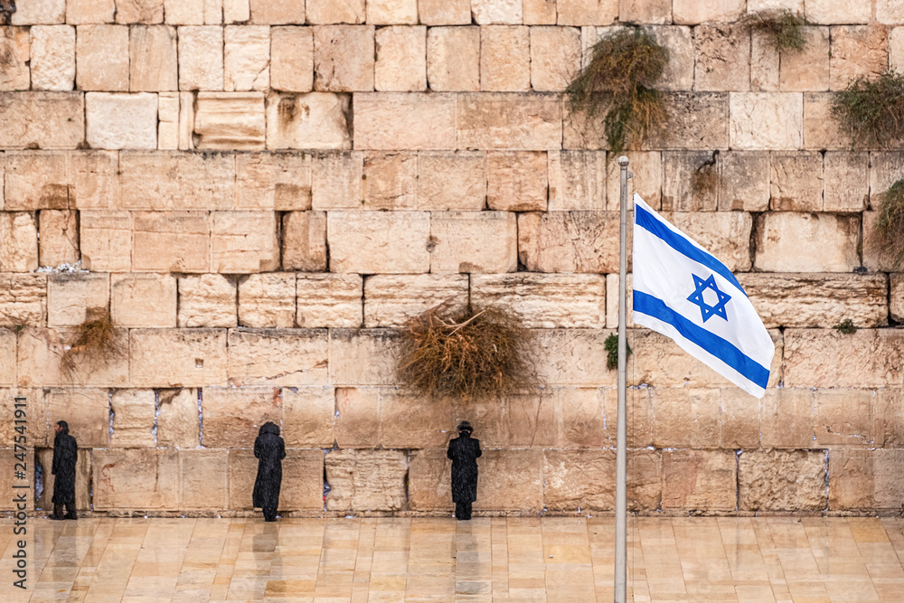 Fototapeta Israeli flag against the western wall on a cloudy day