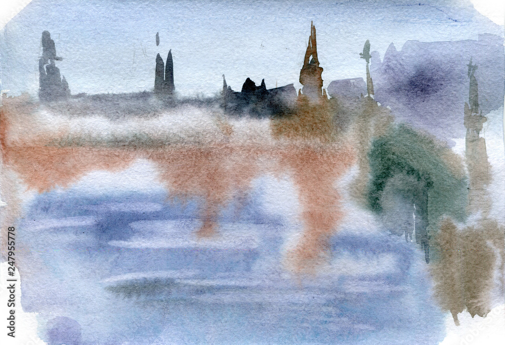 Fototapeta Watercolor landscape of Westminster bridge in London.