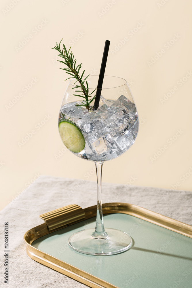 Fototapeta Gin tonic, an aperitif cocktail garnished with cucumber and rosemary