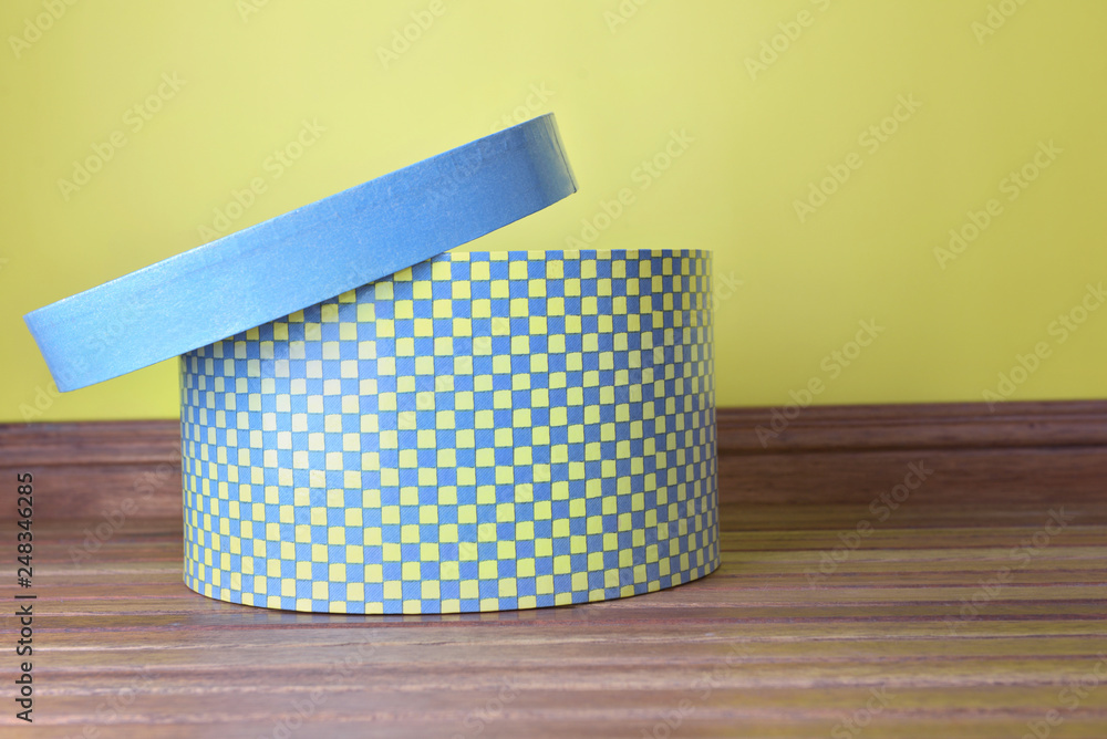 Fototapeta decorative hatbox whith open lid on wooden floor