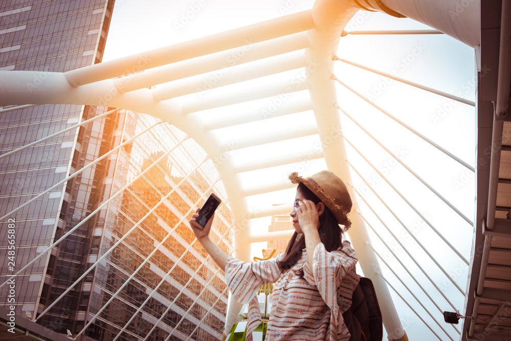 Fototapeta Asian women tourist Playing Smartphone To check out the attractions in Bangkok, Thailand