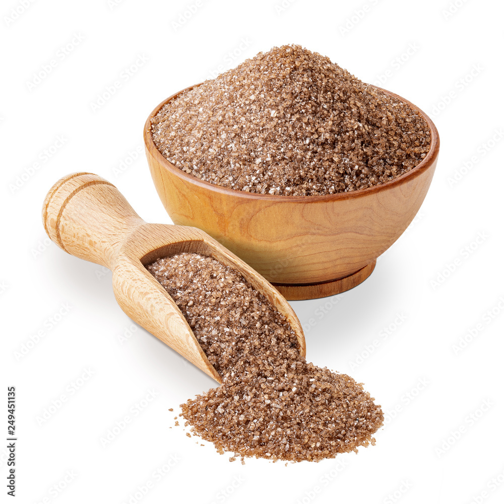 Fototapeta Brown smoked salt in a wooden bowl isolated on white