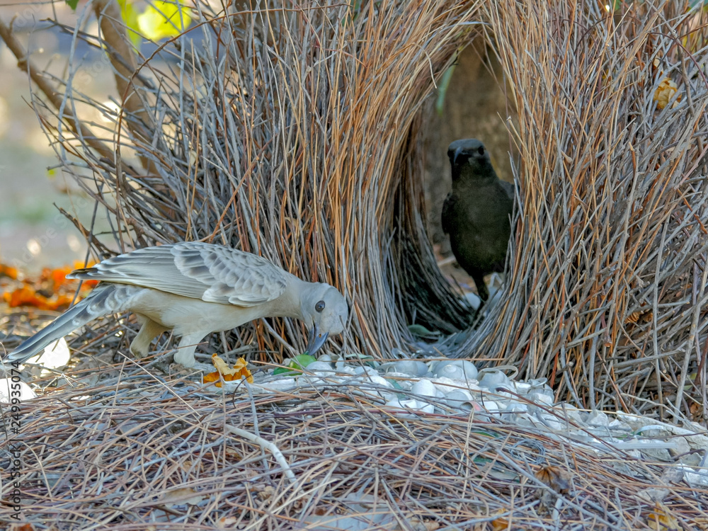 Fototapeta two young bowerbirds practice at a bower of twigs