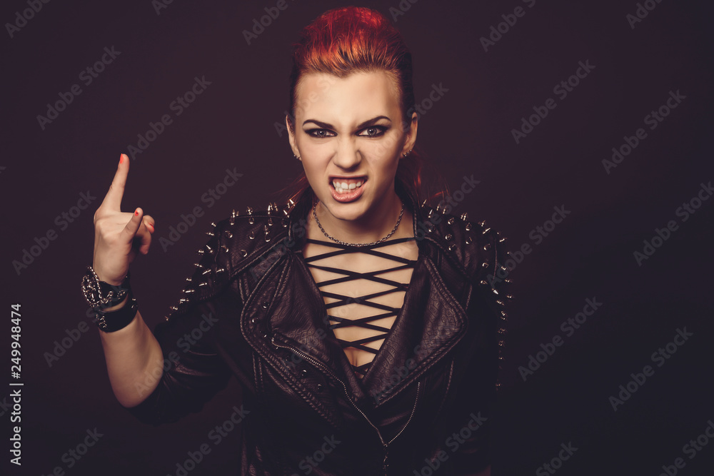 Fototapeta Portrait of a young punk woman with dark leather jacket isolated in studio on black background