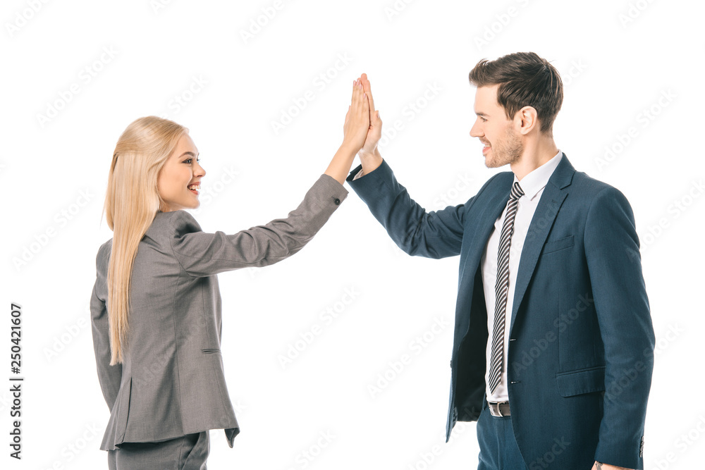 Fototapeta happy professional businesspeople giving highfive isolated on white