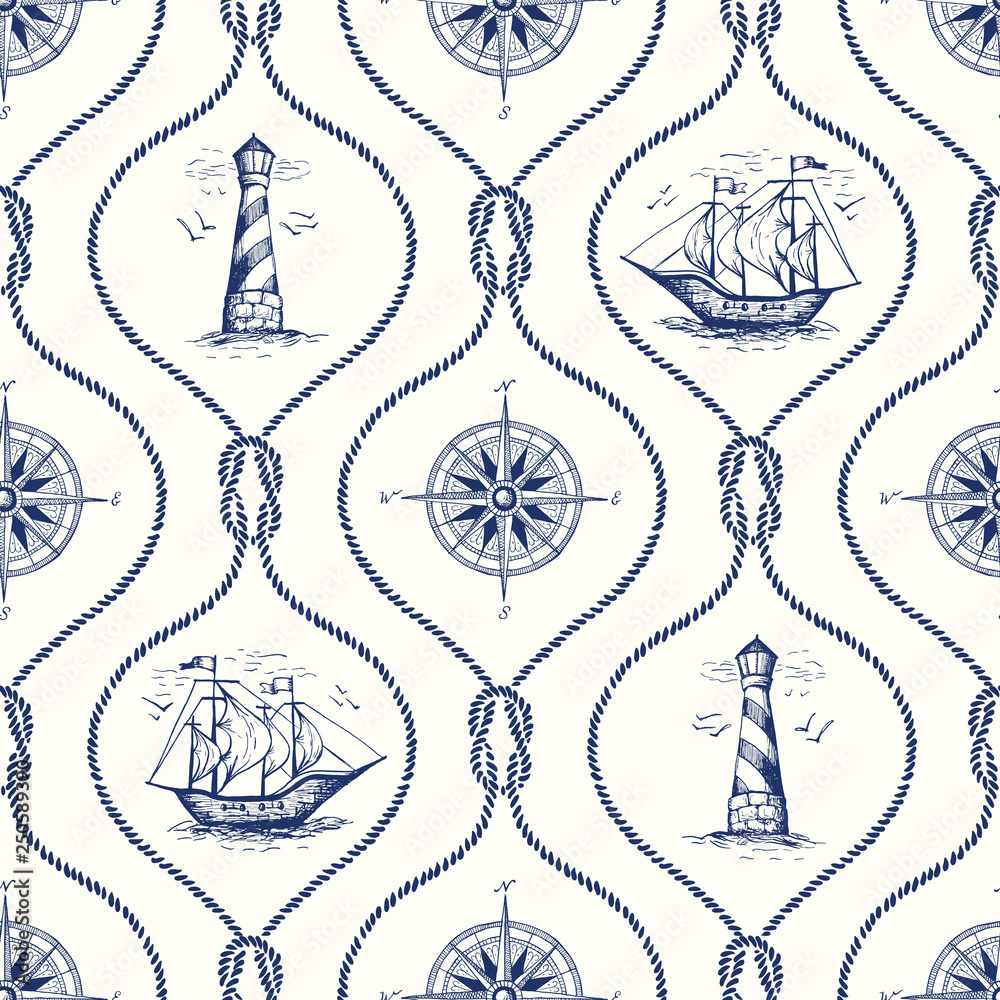 Fototapeta Vintage Hand-Drawn Rope Ogee Vector Seamless Pattern with Lighthouse, Sea Compass, Ship and Nautical Reef Knot