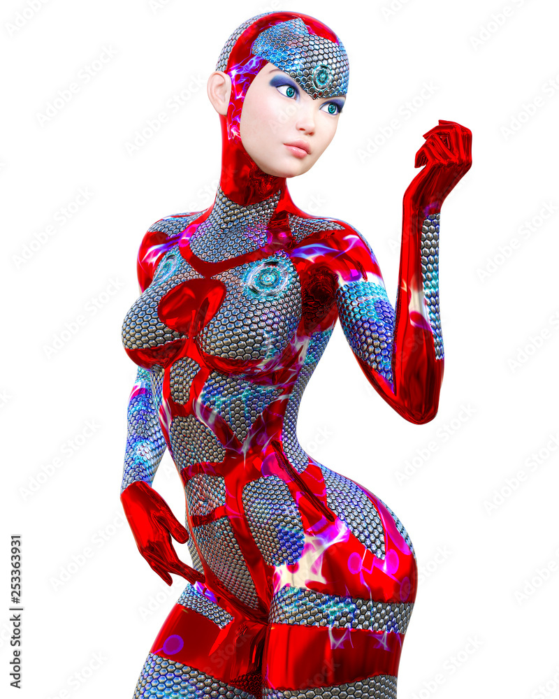 Fototapeta Cyborg droid robot woman futuristic metallic neon suit