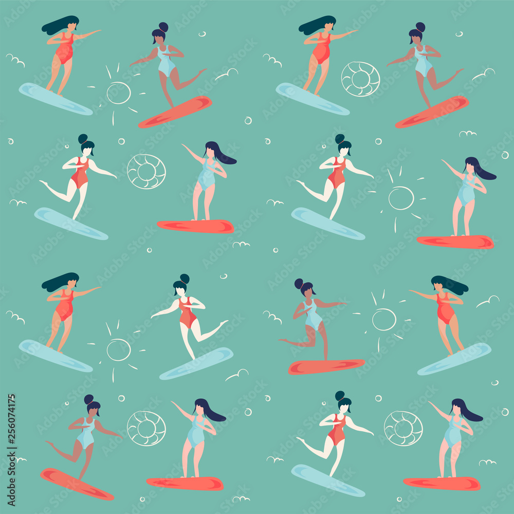 Fototapeta Trendy retro vintage style vector summer vacation pattern illustration: women and girls surfing on surfboards