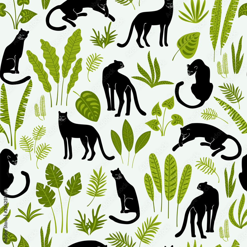 Fototapeta Vestor seamless pattern with panthers and tropical leaves.