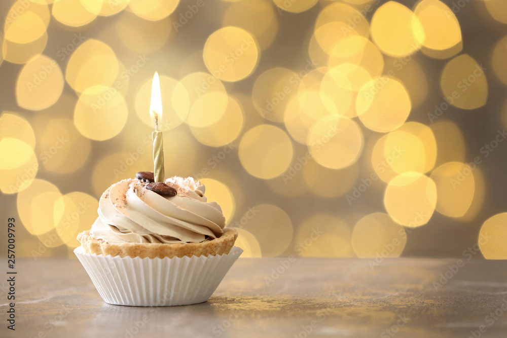 Fototapeta Tasty birthday cupcake with candle on table against blurred lights, space for te