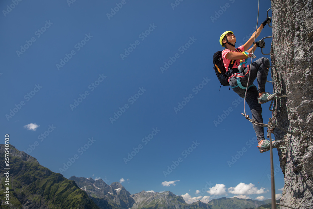 Fototapeta Pretty, female climber on a via ferrata - climbing on a rock in Swiss Alps