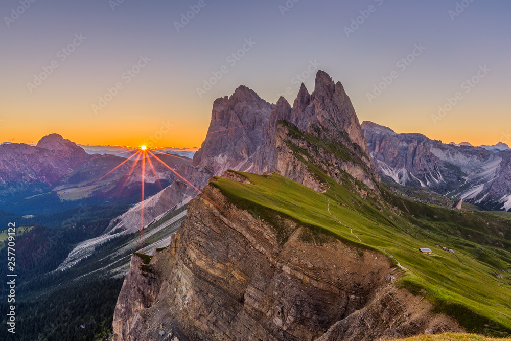 Fototapeta Beautiful sunrise and Odle Mountain landscape in Dolomites, Italy