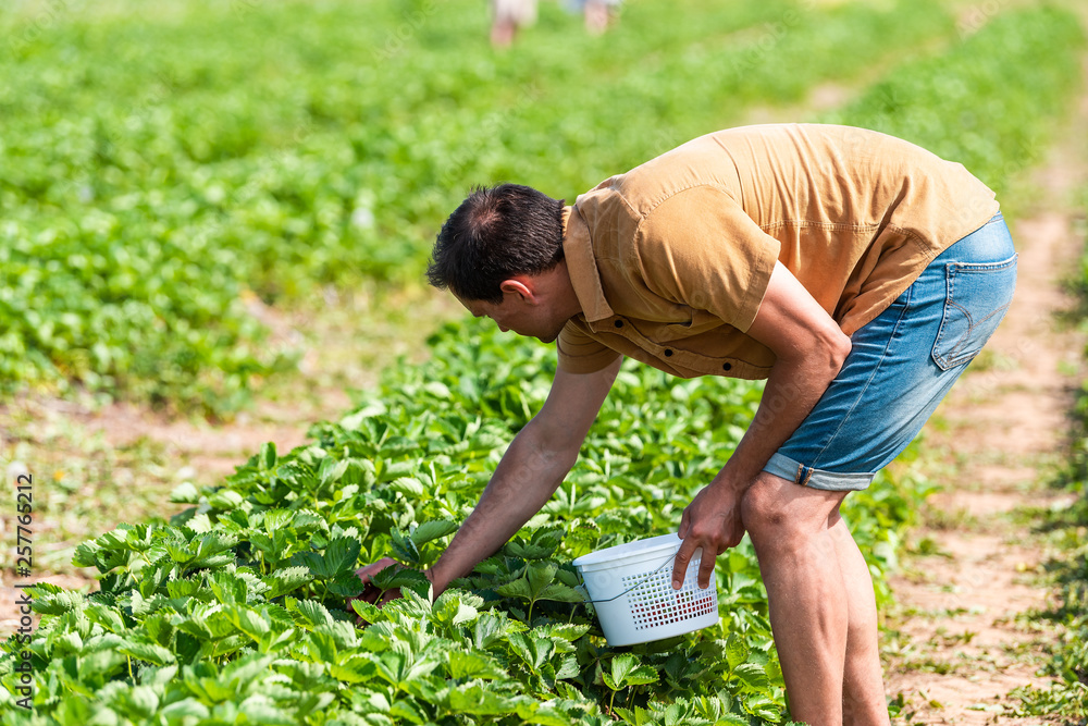 Fototapeta Young man picking strawberries bending over reaching down in green field rows fa