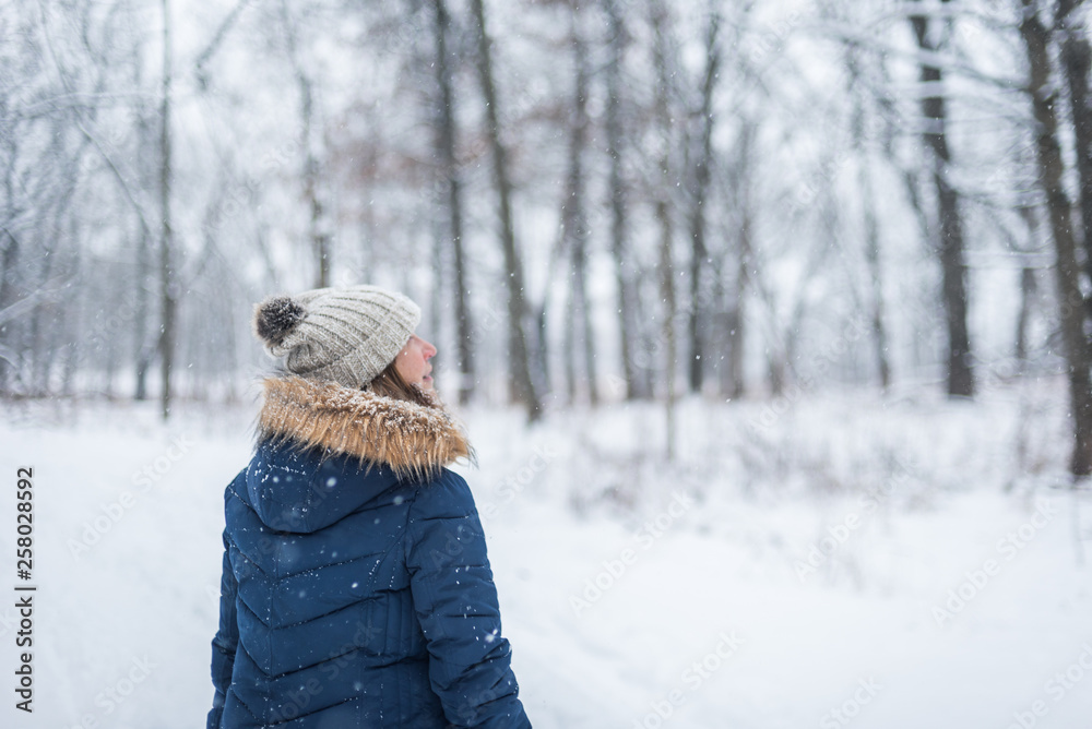Fototapeta happy woman walking in winter woods looking up at snow falling