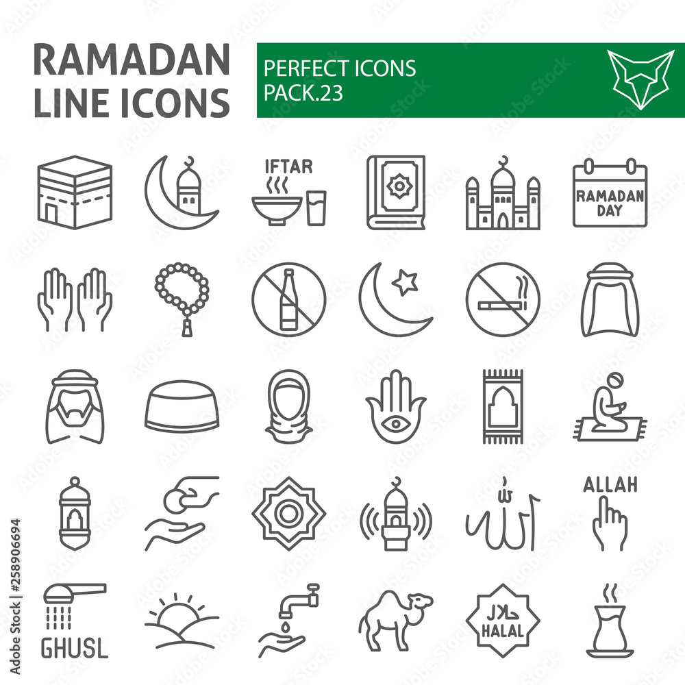 Fototapeta Ramadan line icon set, islamic symbols collection, vector sketches, logo illustrations, muslim signs linear pictograms package isolated on white background