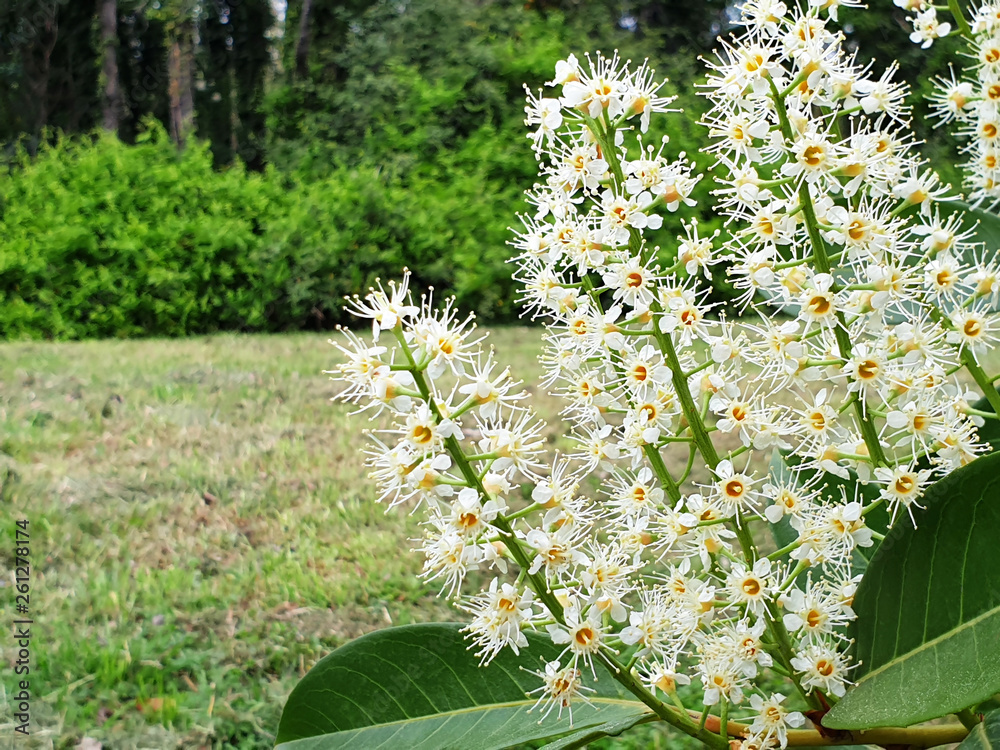 Fototapeta White flowers prunus laurocerasus or Cherry laurel on the background of the park and meadow