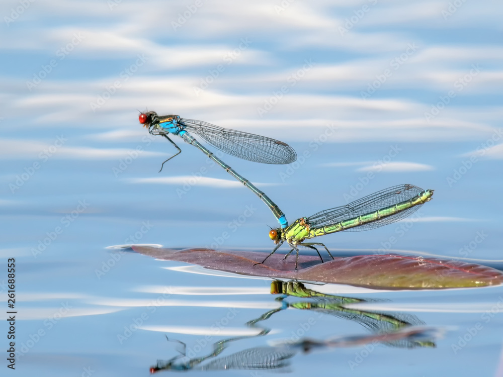 Fototapeta Mating pair of blue and yellow Red-eyed Damselfly or Erythromma najas