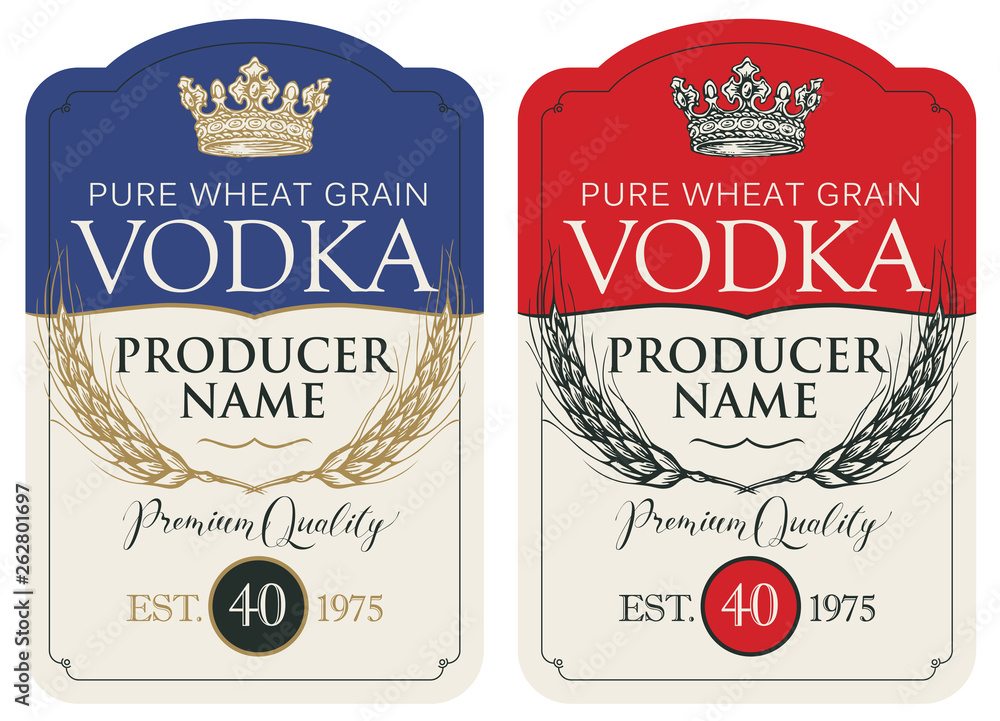 Fototapeta Set of two vector labels for vodka in the figured frame with crown, ears of wheat and inscriptions in retro style
