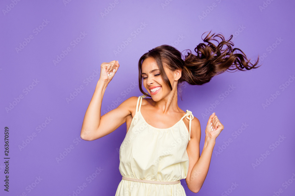 Fototapeta Close up photo of pretty attractive optimistic lovely she her lady raising fists