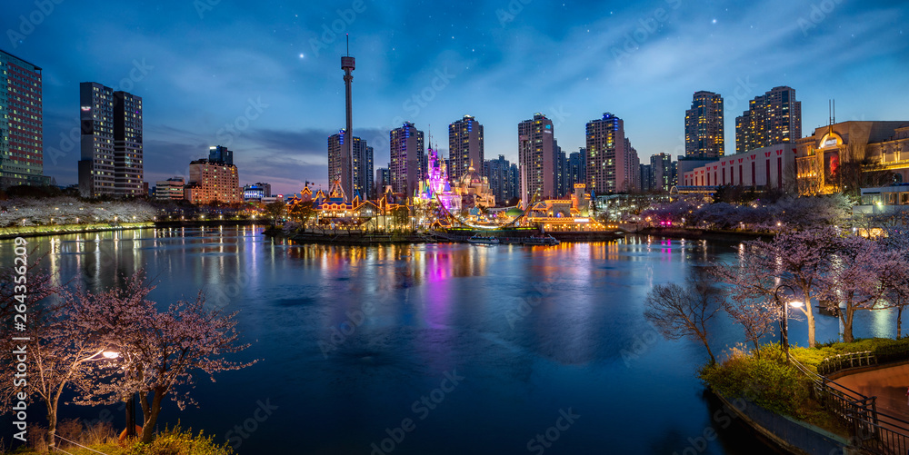 Fototapeta Night cityscape with cherry blossom park and tower