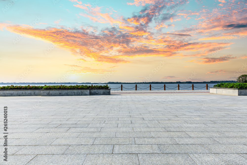 Fototapeta Beautiful lake and walkway with sky clouds at sunset