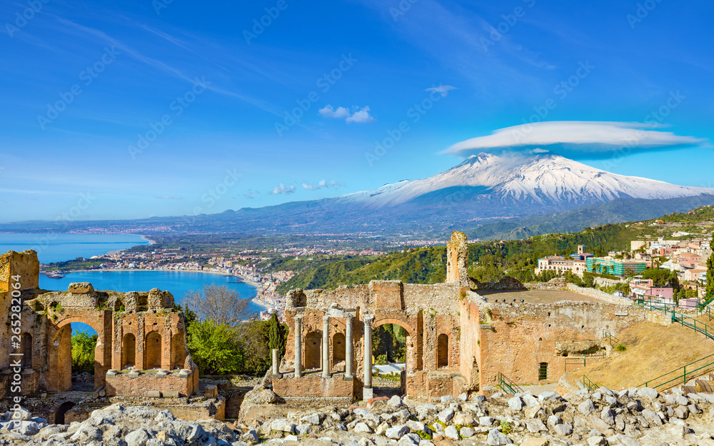 Fototapeta Ancient Greek theatre in Taormina on background of Etna Volcano, Italy