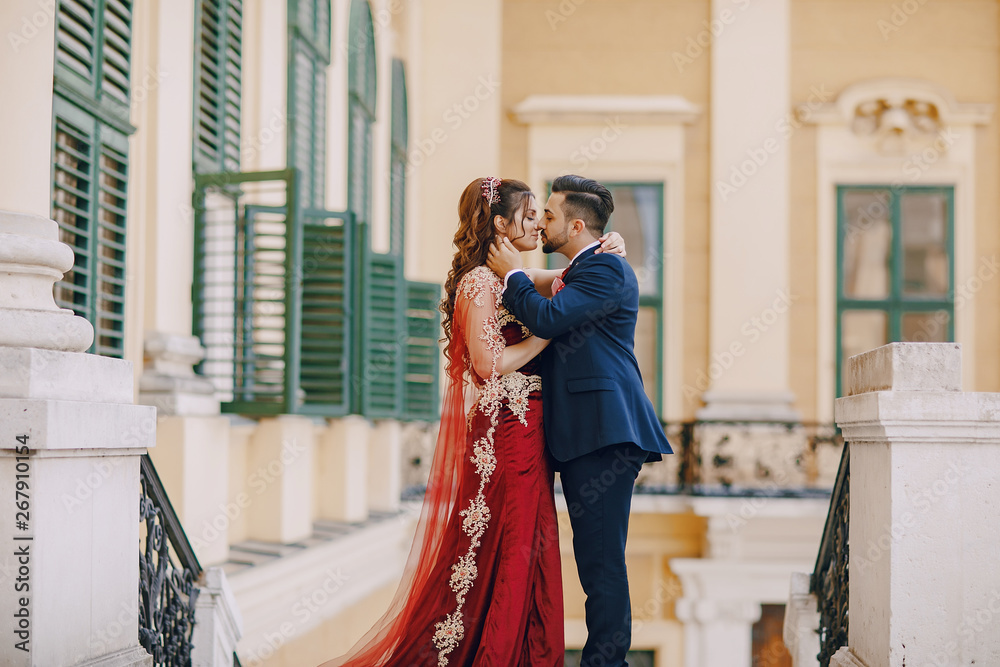Fototapeta Beautiful woman in a long red dress walks around the city with her husband in a