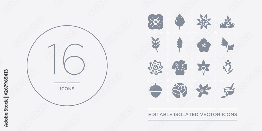 Fototapeta 16 vector icons set such as natural medical pills, neroli, nymphea, oak, oleander contains orchid, pansy, peony, peppermint