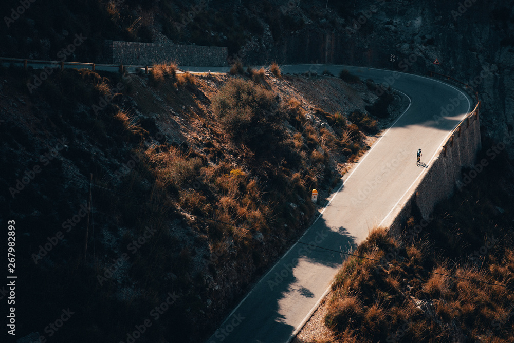 Fototapeta Biker silhouette on the road bicycle ride uphill