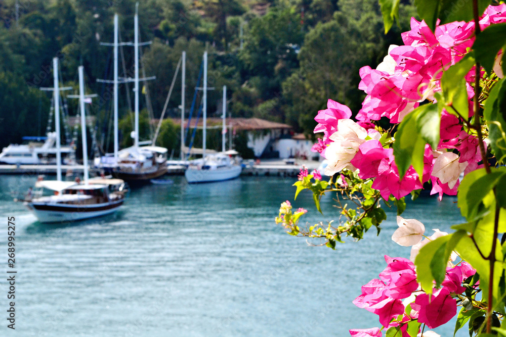 Fototapeta Beautiful bougainvillaea in pink and white colors with boats on the backgrtound