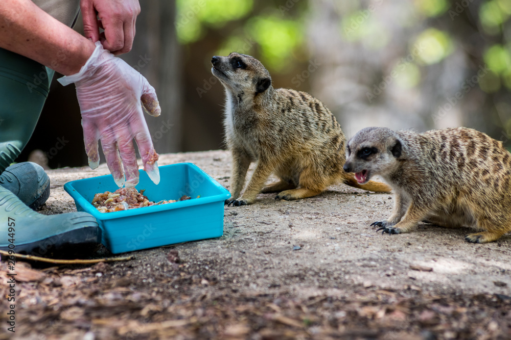 Fototapeta A hand of a woman getting ready to feed a couple of meerkats or suricate (Surica