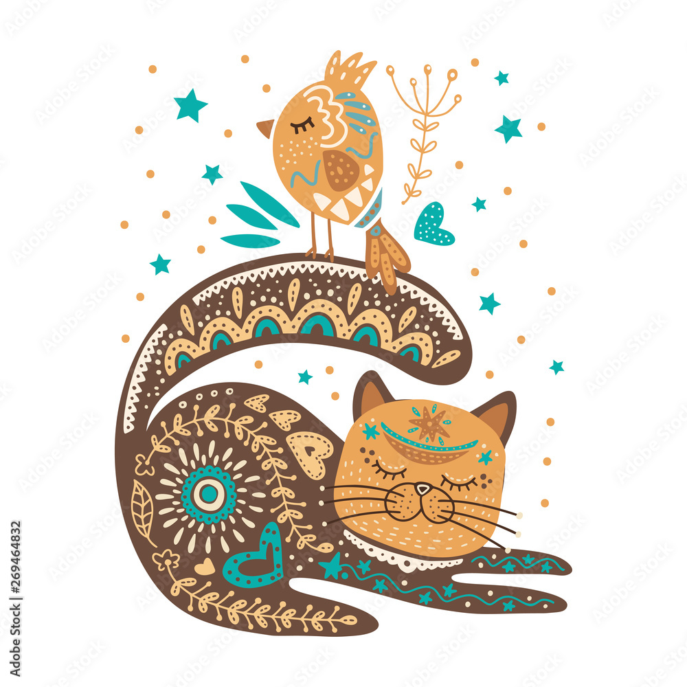 Fototapeta Folk art vector cat and bird.