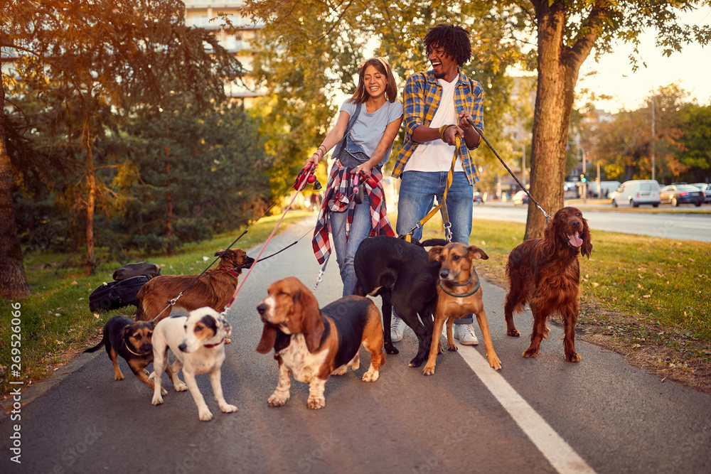 Fototapeta Happy woman and man dog walker with dogs enjoying in walk..