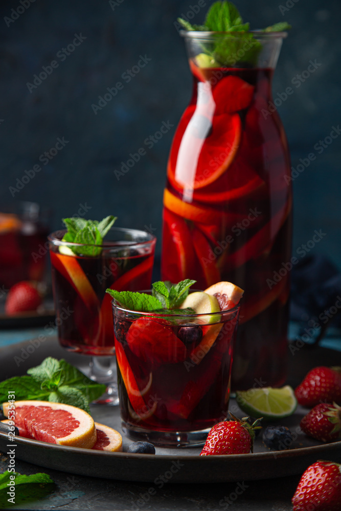 Fototapeta glass of homemade red wine sangria with fruits and berries