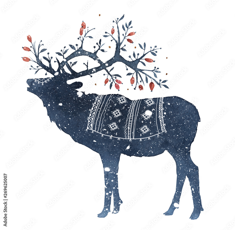 Fototapeta Watercolor illustration of deer with magic horns in the snow isolated on white b