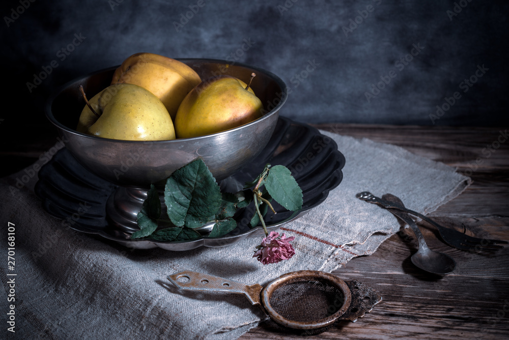 Fototapeta Still life with melchior bowl, apples and vintage cutlery