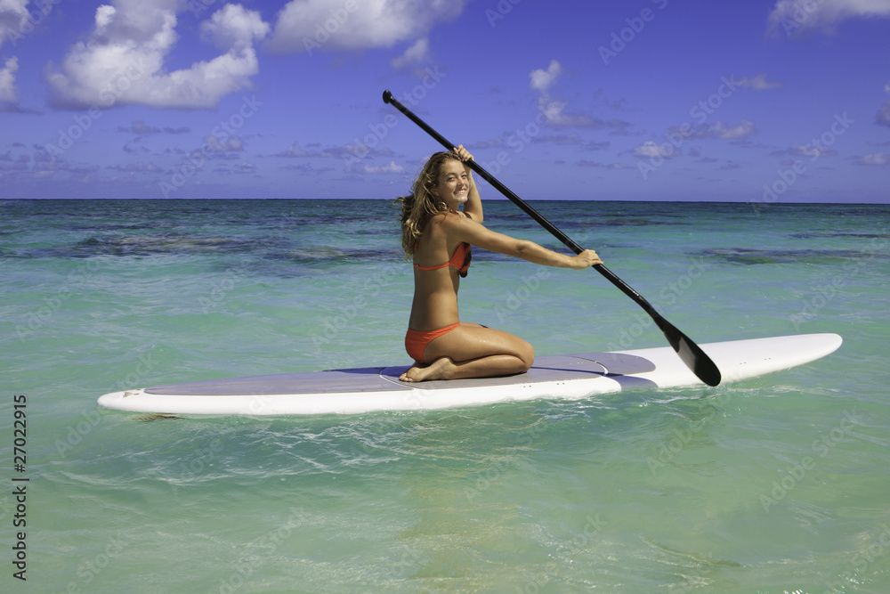 Fototapeta teenage girl in bikini on a paddle board in hawaii