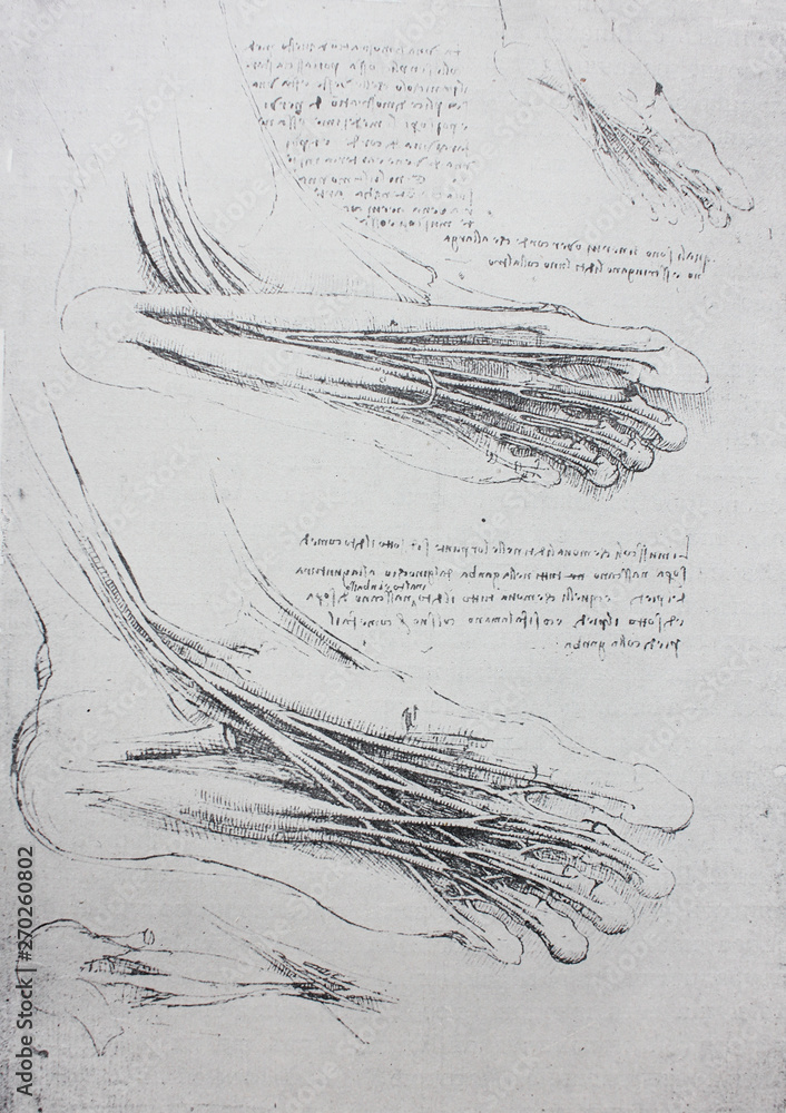 Anatomical notes. Leg, foot. Manuscripts of Leonardo da Vinci in the vintage book Leonardo da Vinci by A.L. Volynskiy, St. Petersburg, 1899