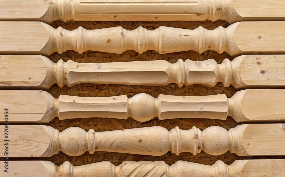Fototapeta Wooden balusters of pine for the staircase railing.