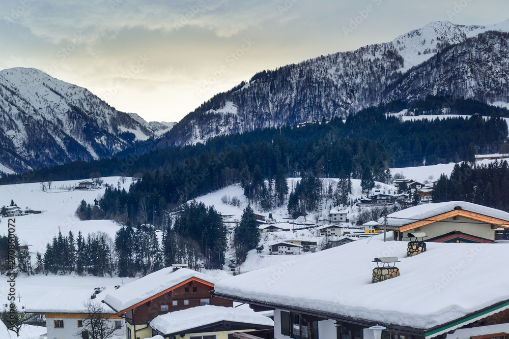 Fototapeta TYROL, AUSTRIA: Alpine landscape with houses and snow in winter.