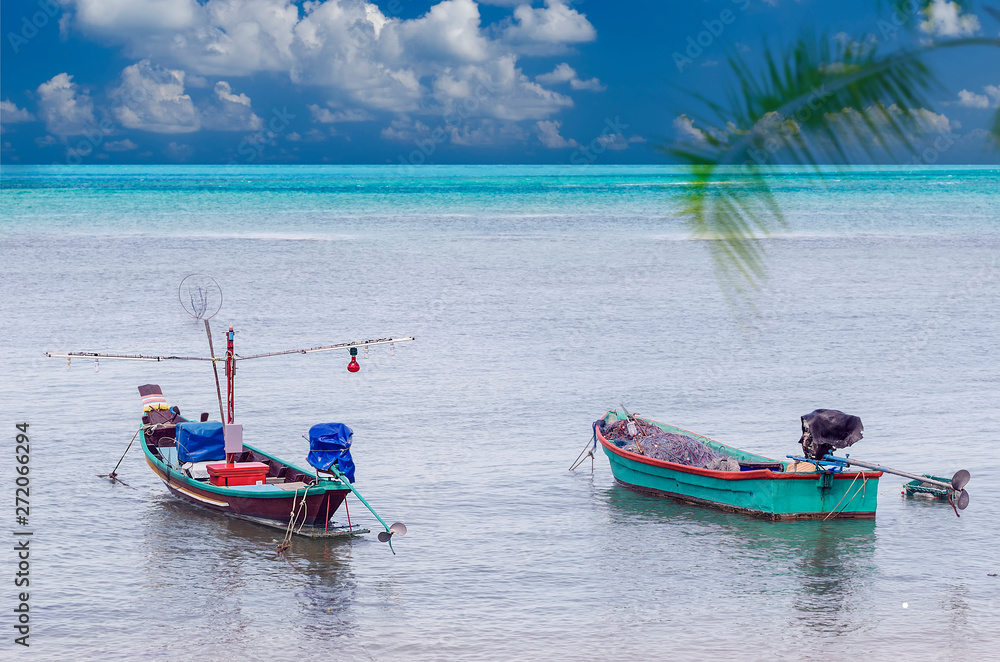Fototapeta Fishing boats anchored at blue lagooon.