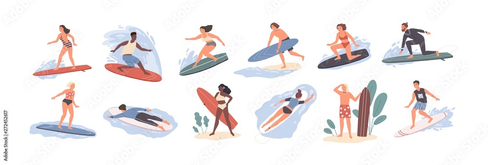 Fototapeta Collection of cute funny people in swimwear surfing in sea or ocean