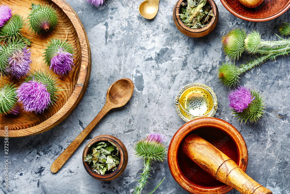 Fototapeta Milk thistle with flowers