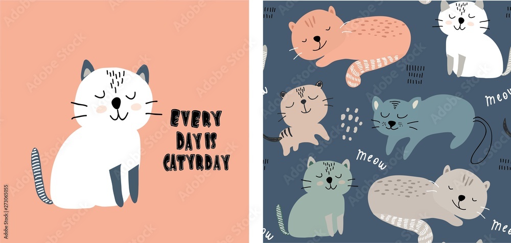 Fototapeta set of cute cat print and seamless pattern with cats. vector