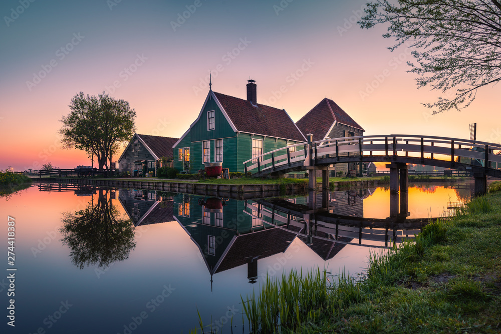 Fototapeta Historisches Holzhaus in Holland bei Sonnenaufgang