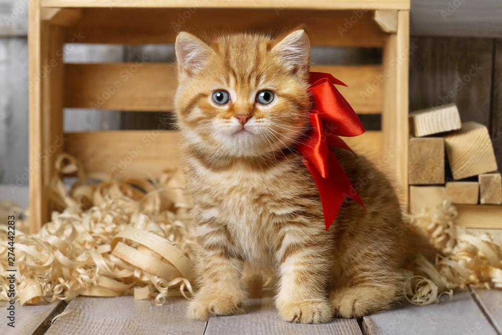 Fototapeta Cute kitten playing in wood shavings