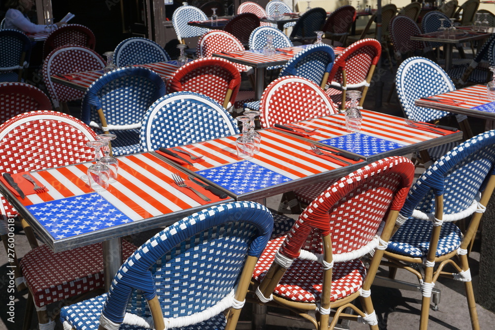 Fototapeta fun and colorful tables and chairs at a terrace in France wth the American flag